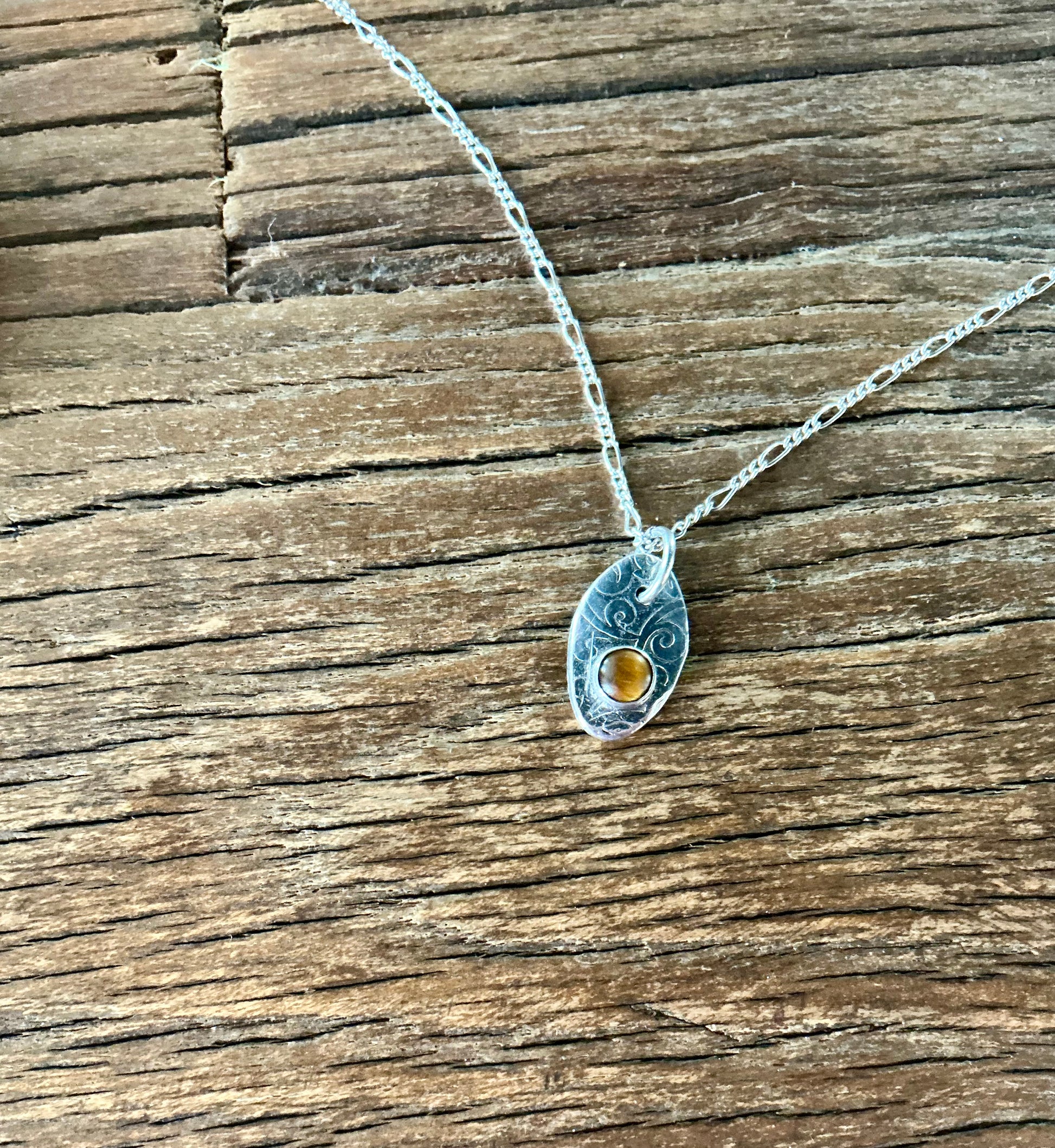 This necklace features a small tigers eye stone set on a fine silver decorative backing. Tigers eye is known to bring its wearer courage, protection and good luck. This is the perfect everyday piece to serve as your good luck charm. The chain is 18” with an approximately 1/2” charm.
