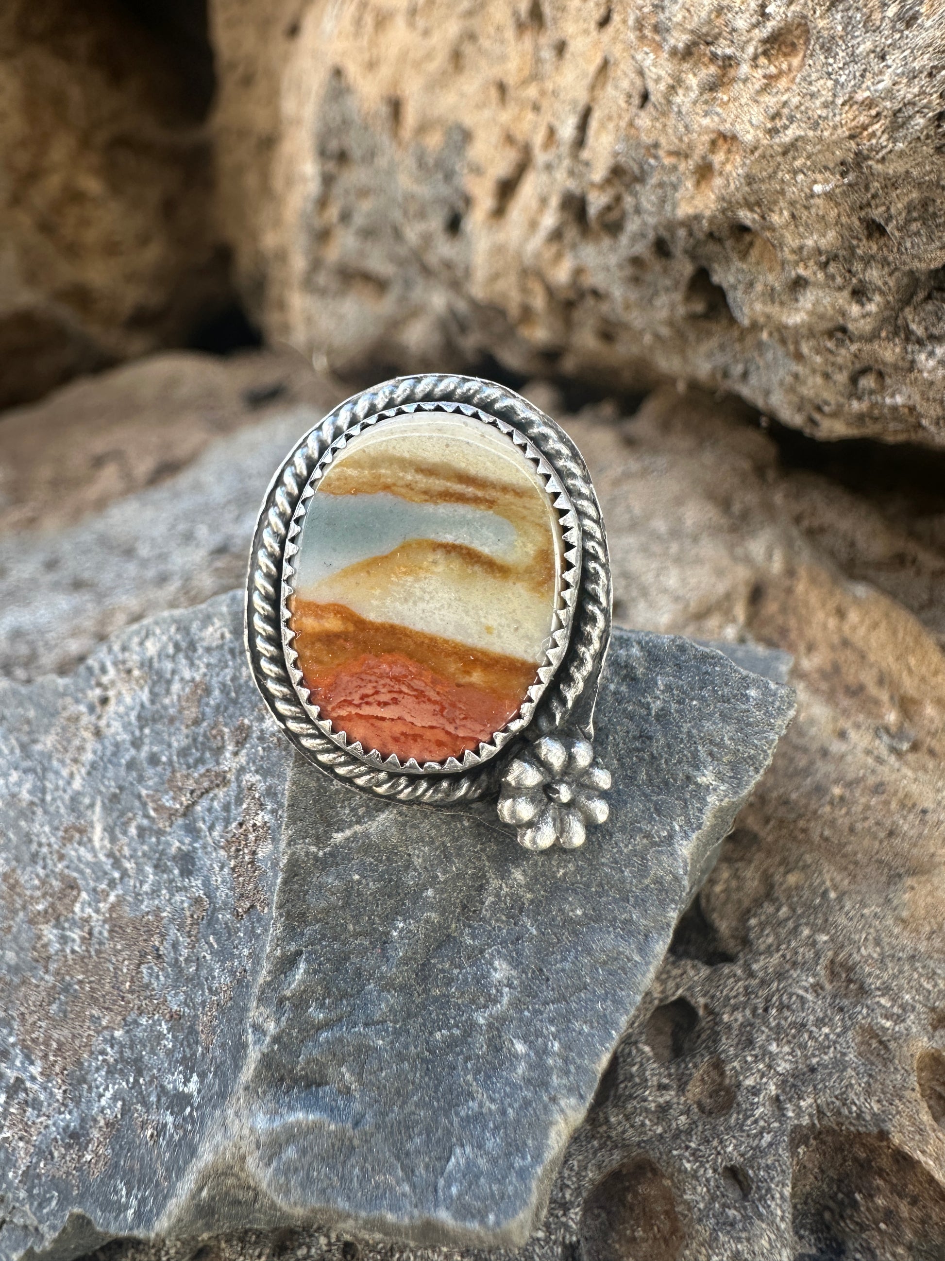 This ring serves as a reminder that flowers bloom even in the desert heat. This beauty has beautiful colors of orange and blue with a twisted bezel and fine silver flower accent. This is a truly unique piece that will have your friends asking “where did you get that”? Size 7.