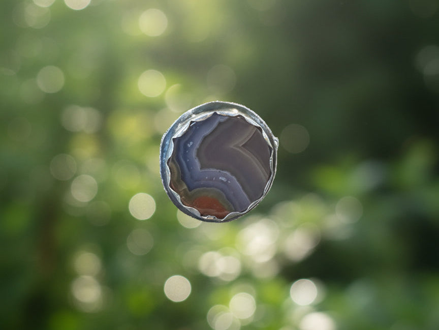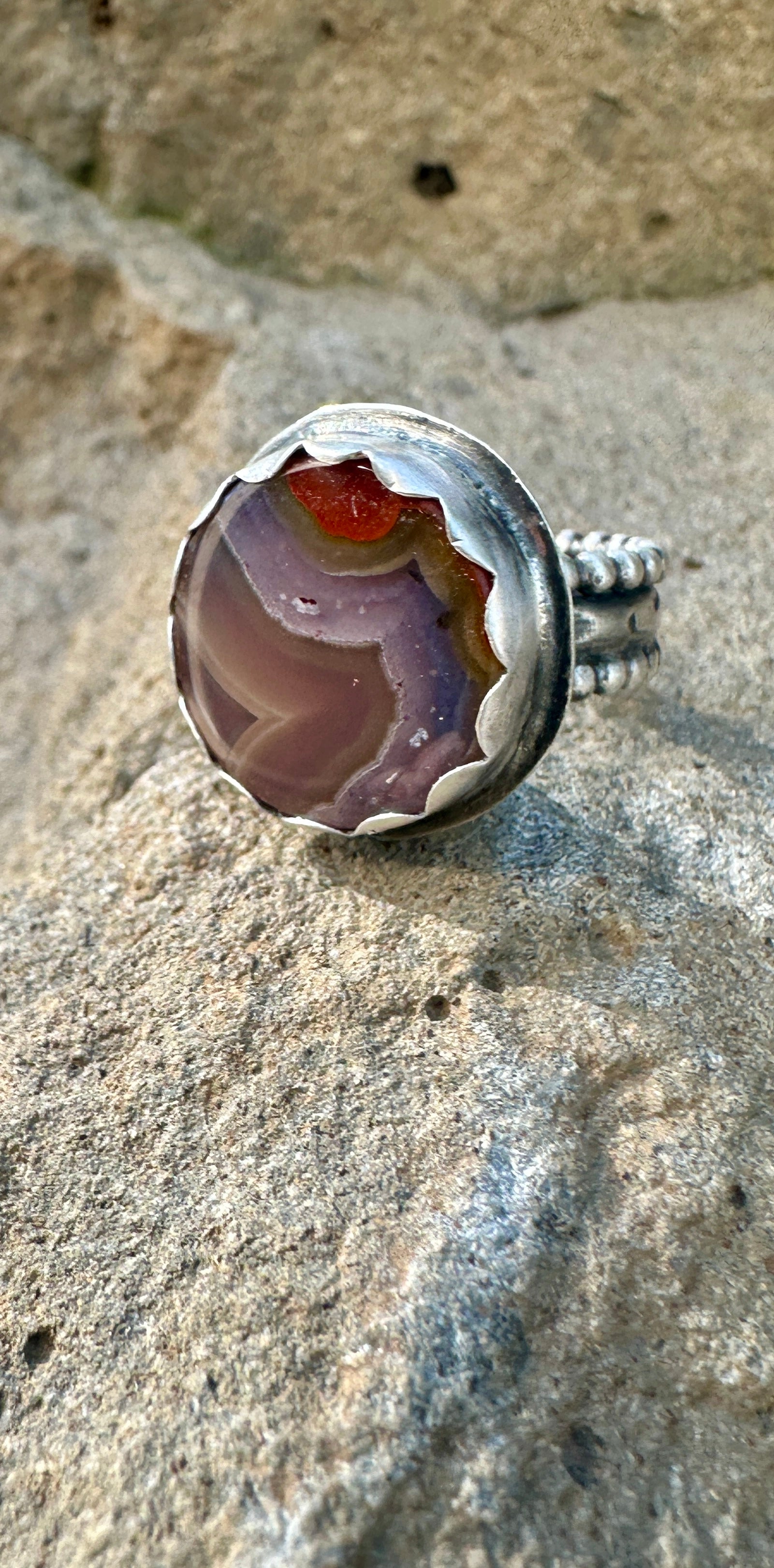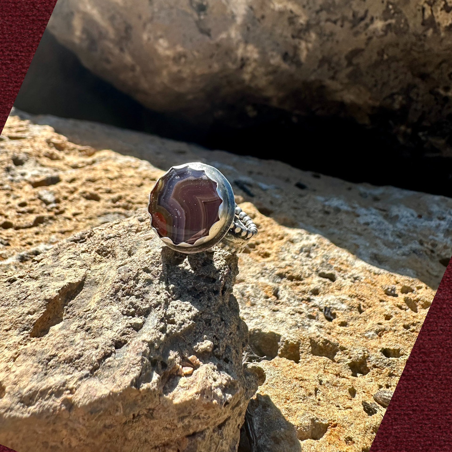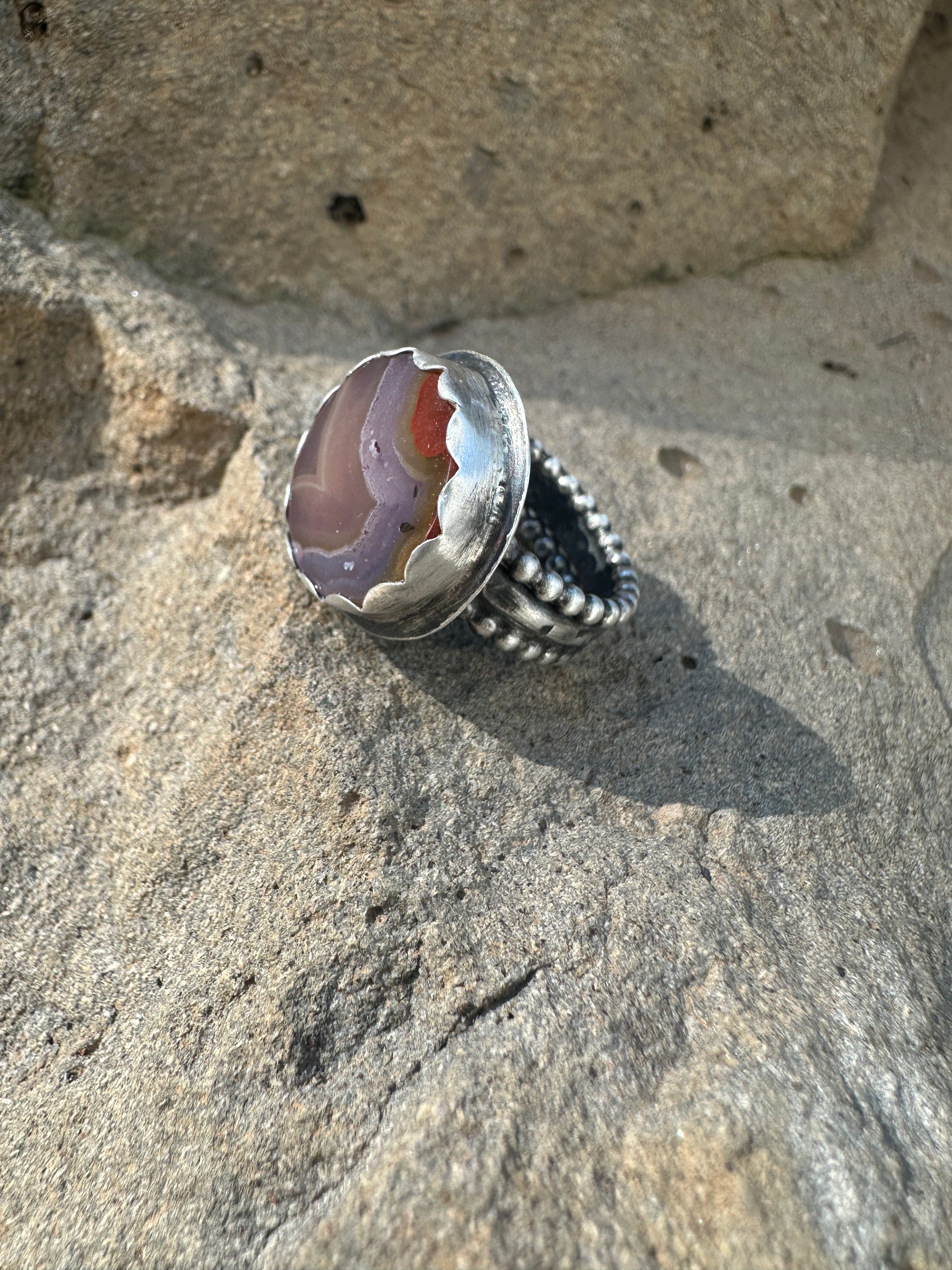 Why hang art on your walls when you can wear it?!? This beautiful Moroccan Agate is placed on a triple band and is blackened for effect. This treasure is a size 7.5 and is sure to fit on one of your fingers. This is a one of a kind handmade piece and is a true treasure.
