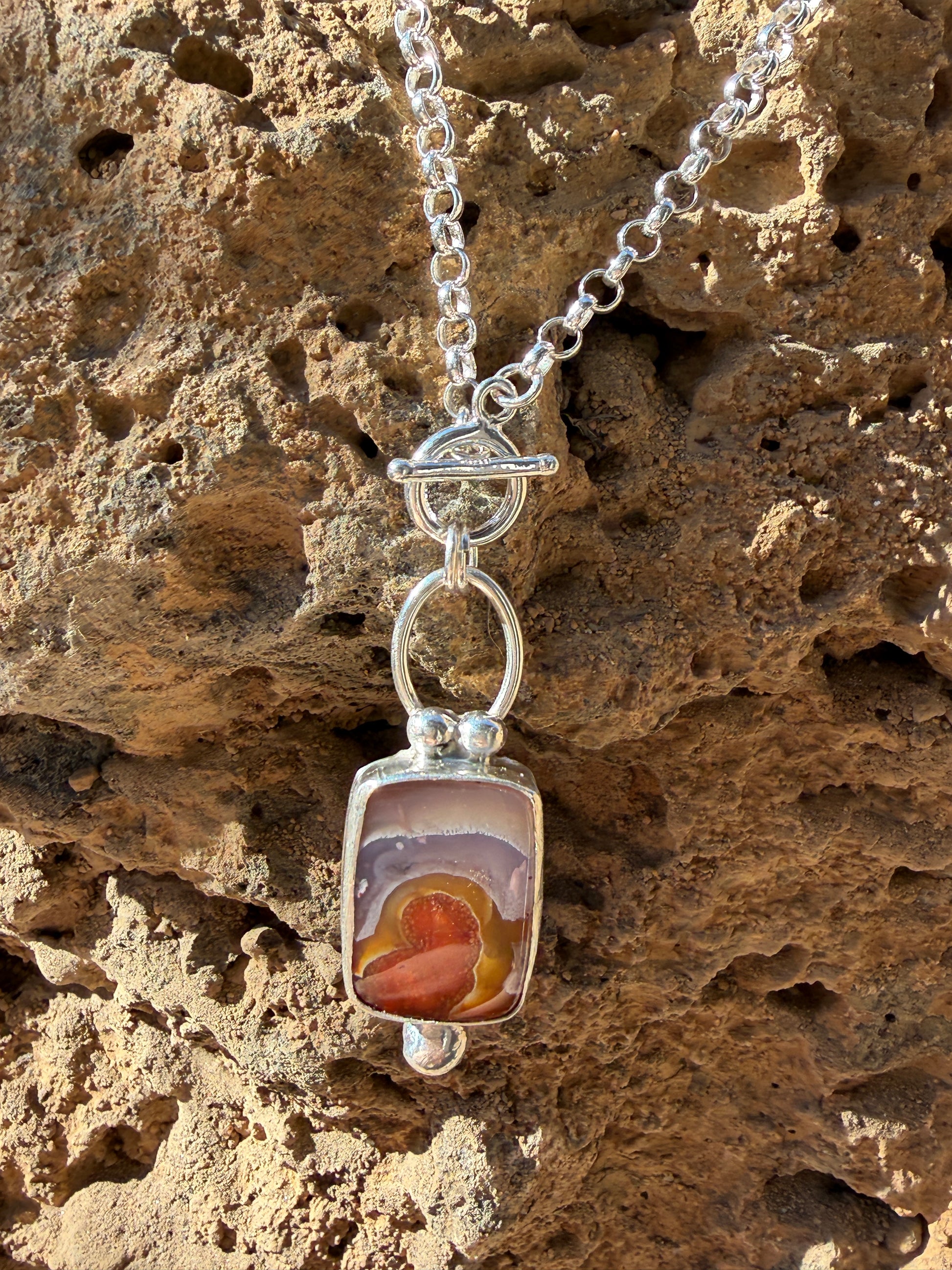 This Moroccan Agate is set in sterling silver. It is placed on a cool sterling silver chain with a front clasp. This is one you will easily wear for many years.
