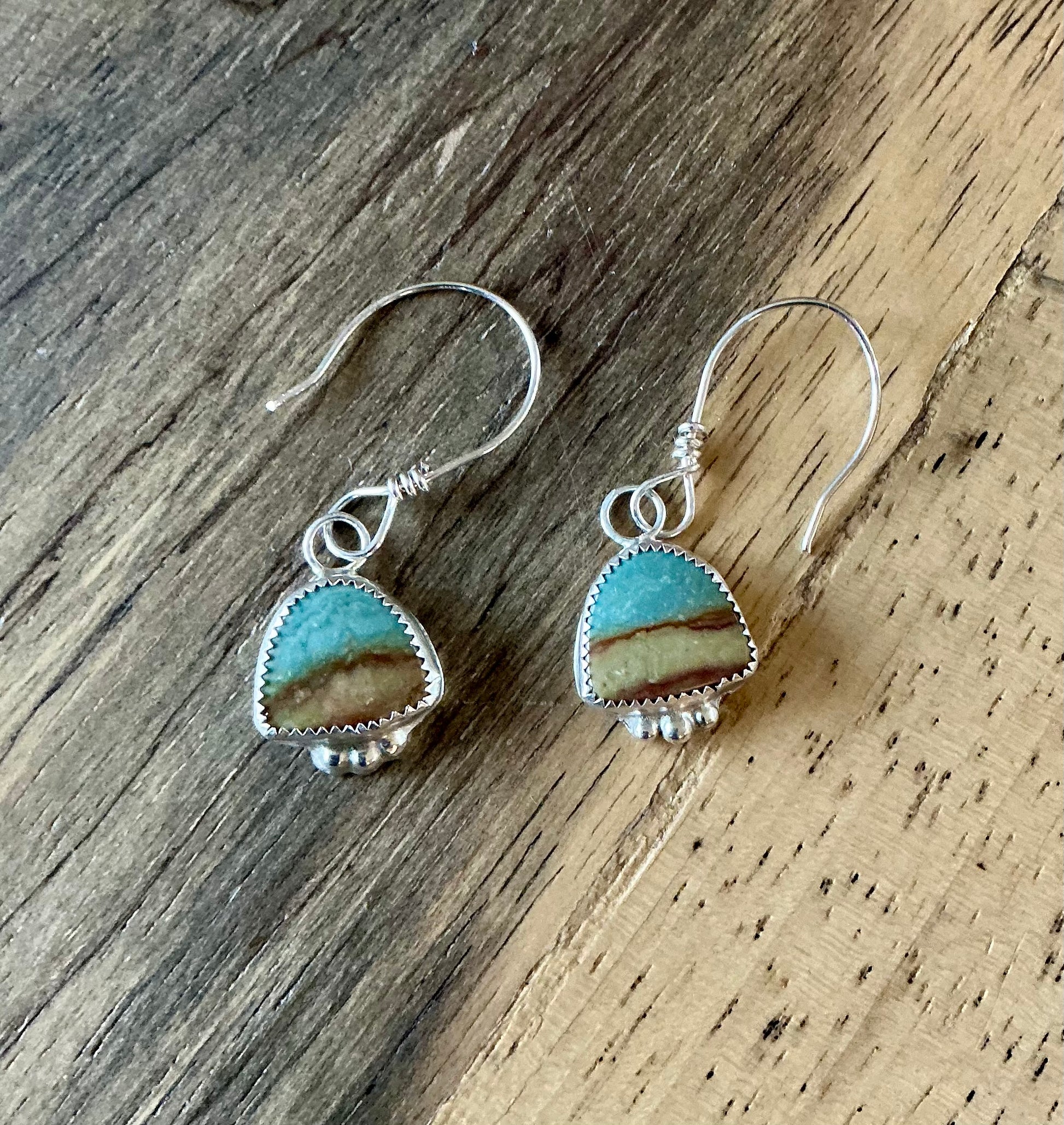 These picture jasper earrings are set in sterling silver with silver ball accents. They hang from silver earring wires. These are a one-of-a kind handmade item
