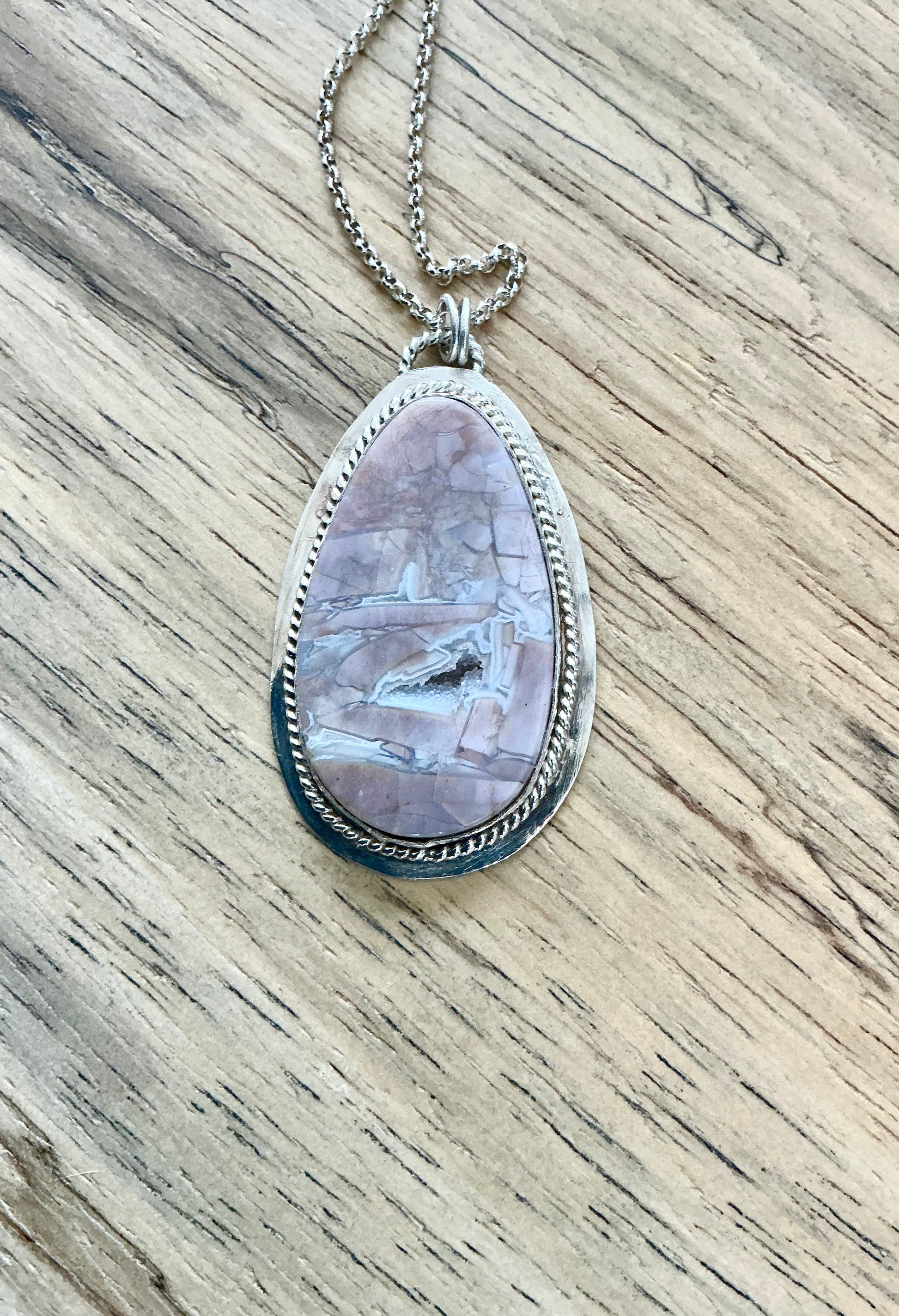 This statement pink jasper pendant necklace features a raw druzy pocket that sparkles in the light. This statement necklace reminds us that raw beauty can be found below the surface. It is set in sterling silver and placed on an 18” chain. Other chain options available upon request.