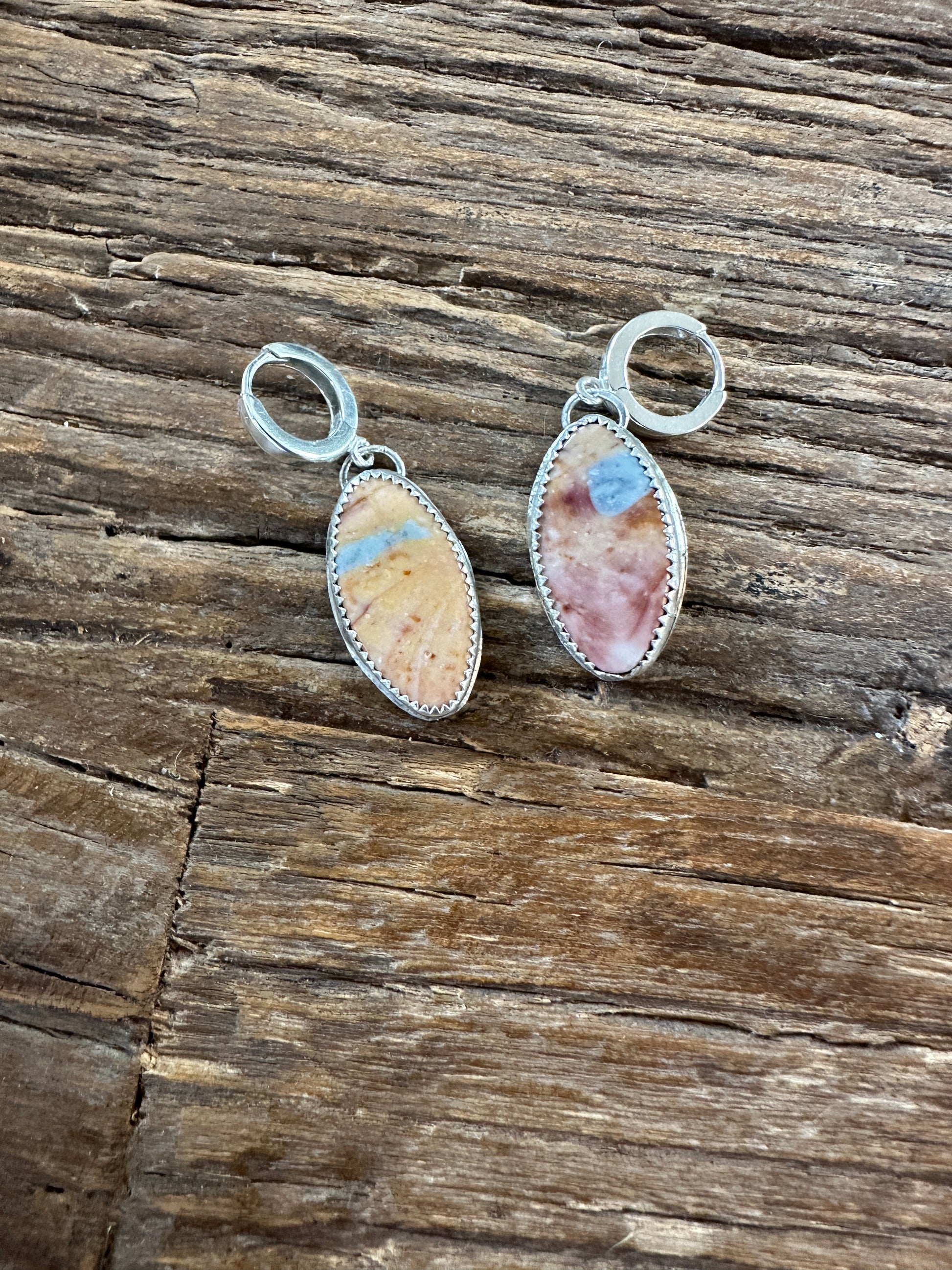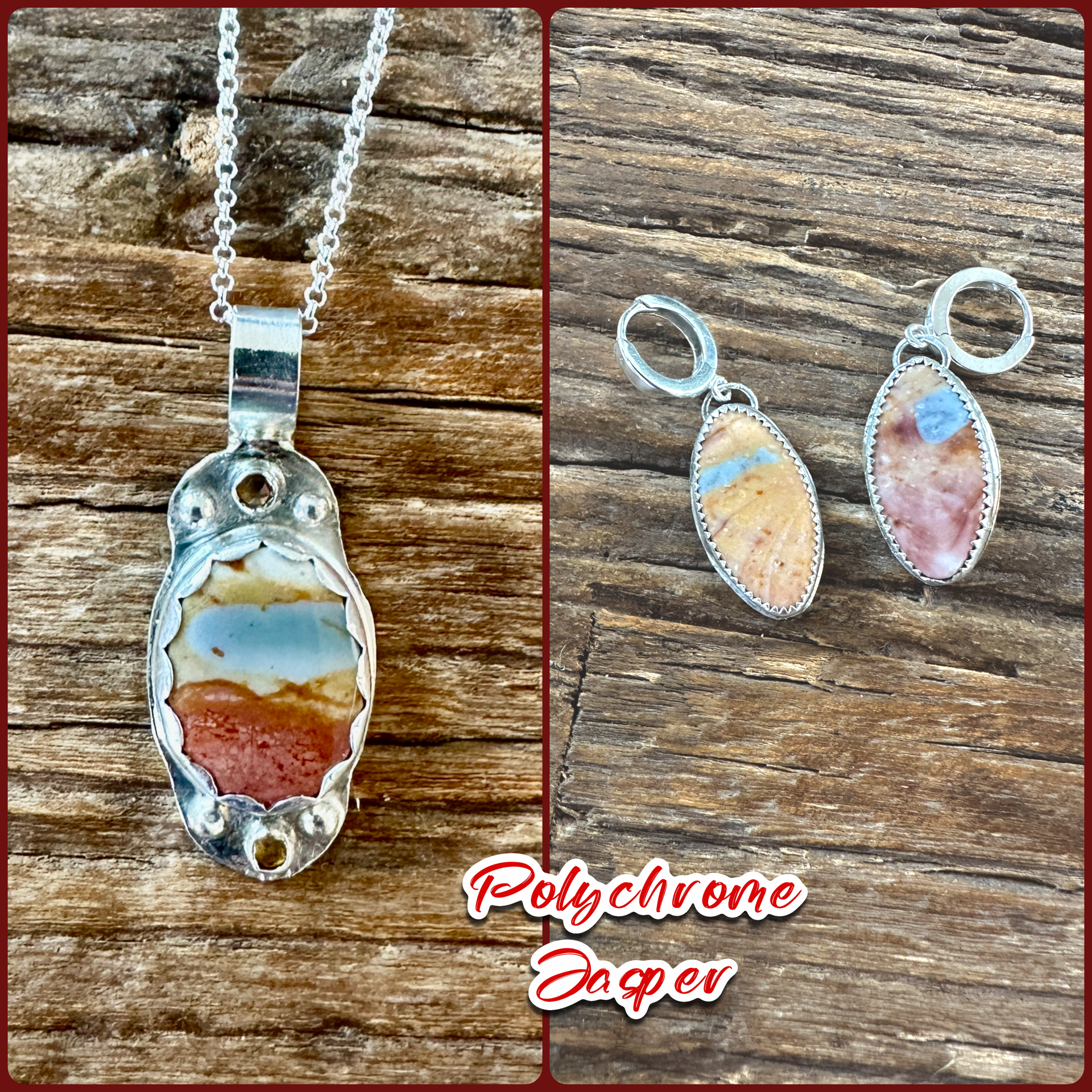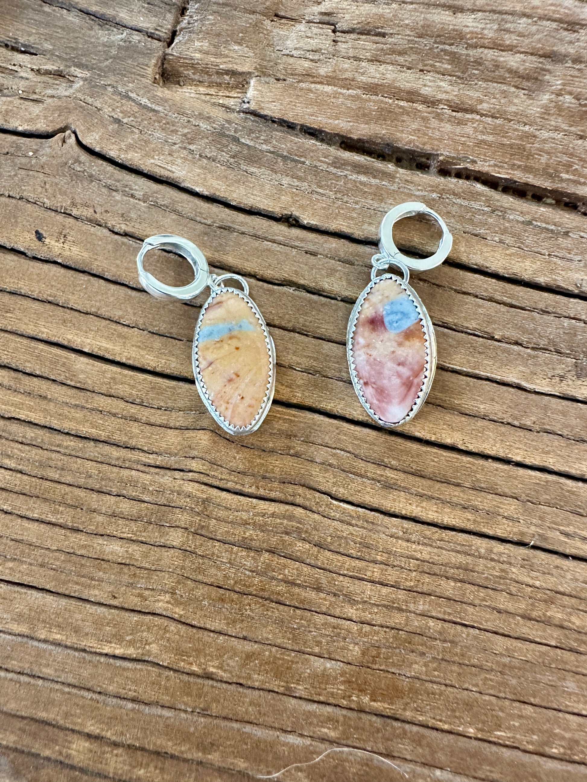 These polychrome jasper stones work beautifully on these huggie hoops. They pair well with any outfit from work to play. They go nicely with the necklace shown in the third photo. These are hand-cut natural stones on sterling silver hoops making a one of a kind piece.
