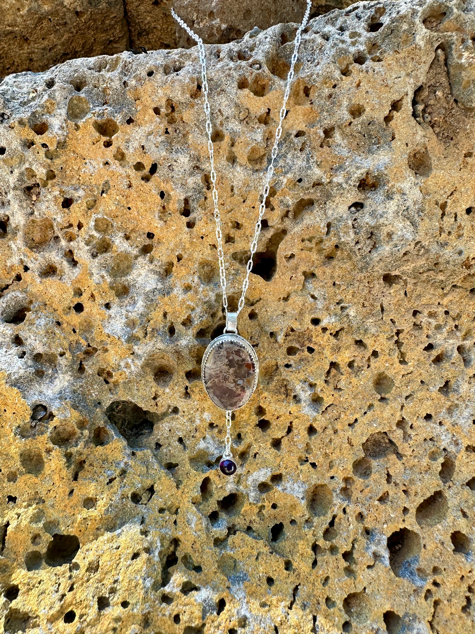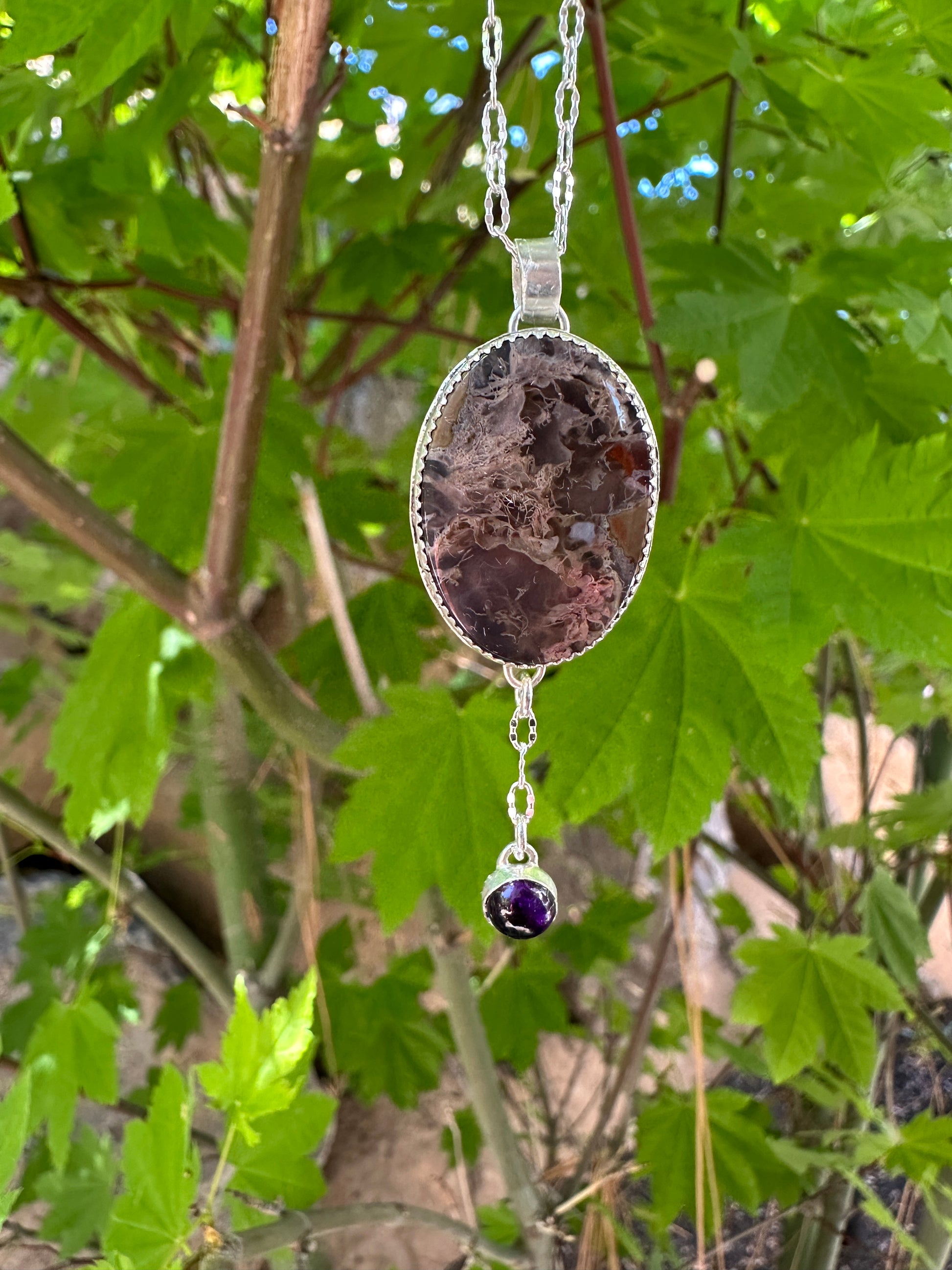 Nature's beauty is on display with this moss agate necklace. This stone is mesmerizing. It is set in sterling silver and has a 6mm amethyst dangling just right to highlight the beautiful purple in the agate. The chain is 17" and the total length of the necklace is 10.5". For a set check out the Richardson Ranch Moss Agate ring.