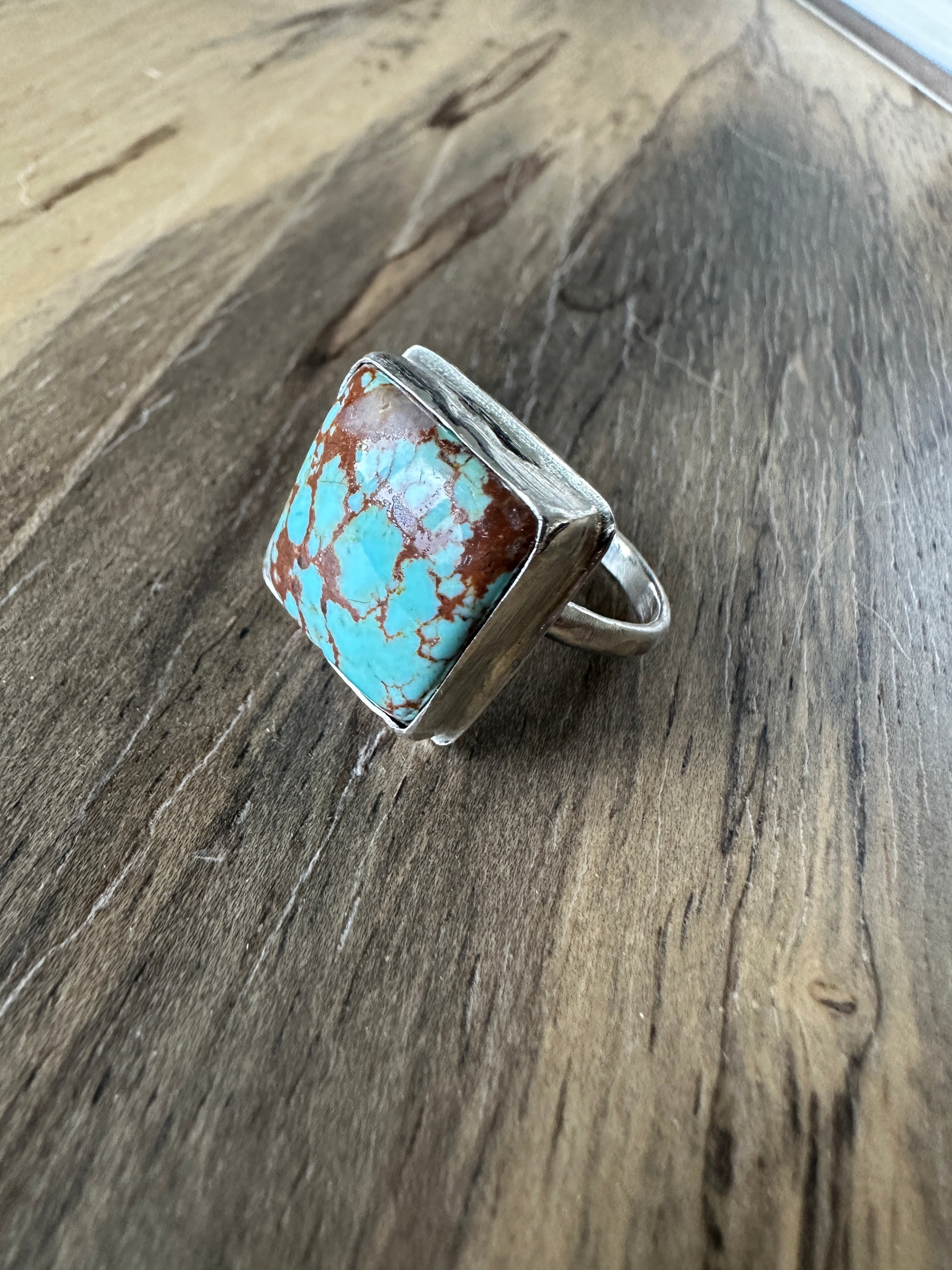 This square Royston Turquoise Ring features a stone from the Otteson brothers mine in the USA. It is simply set in sterling silver but is far from simple in appearance. The ring is a US size 8 textured band. Hand made and one of a kind!