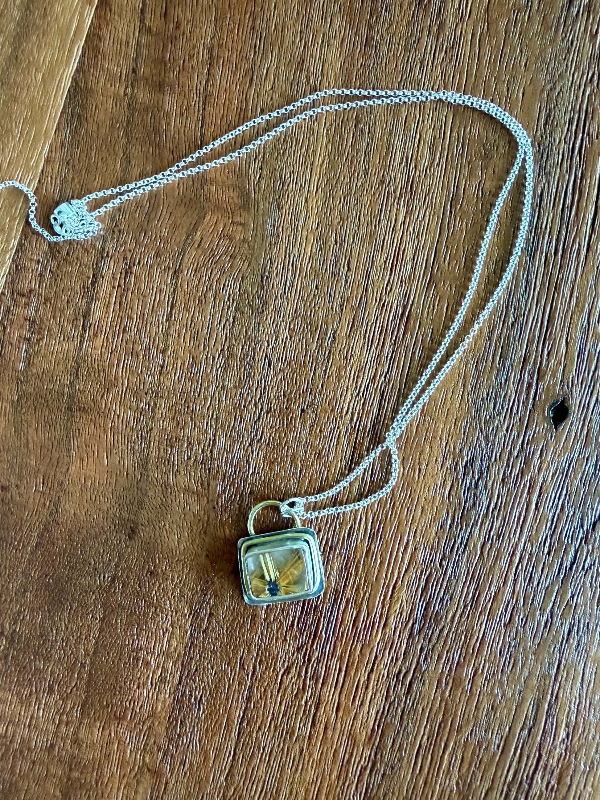 This Rutilated quartz necklace looks so much like a little flower. The natural rock is set in sterling silver and framed in brass. This little cutie is placed on an adjustable sterling silver chain (up to 21”). Perfect for an everyday piece!