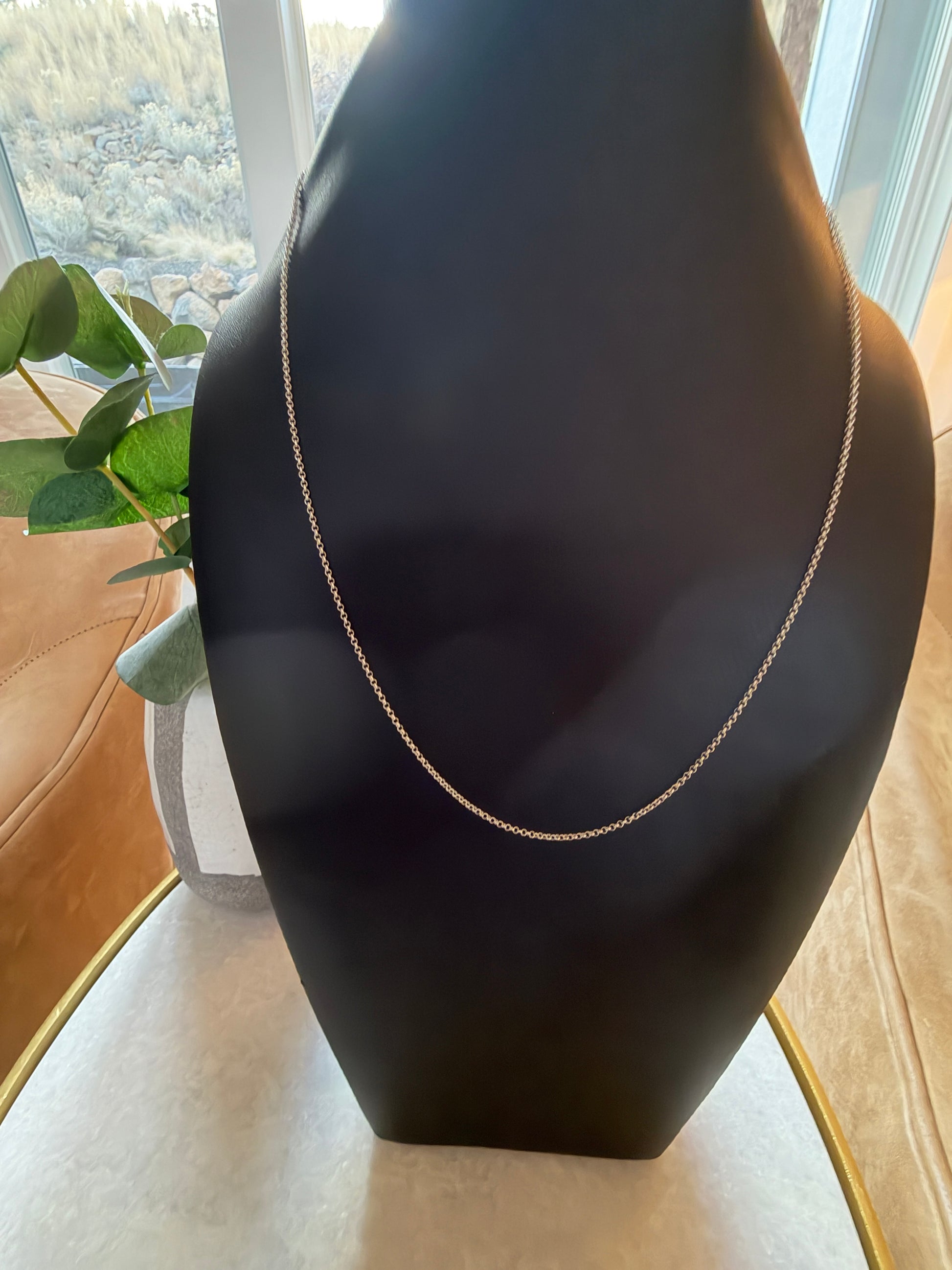 This round roll chain features a movable silicone-lined bead that allows you to adjust the chain to any length up to 22”. The end of the chain is finished with a round bead accent. This necklace is a customer favorite.