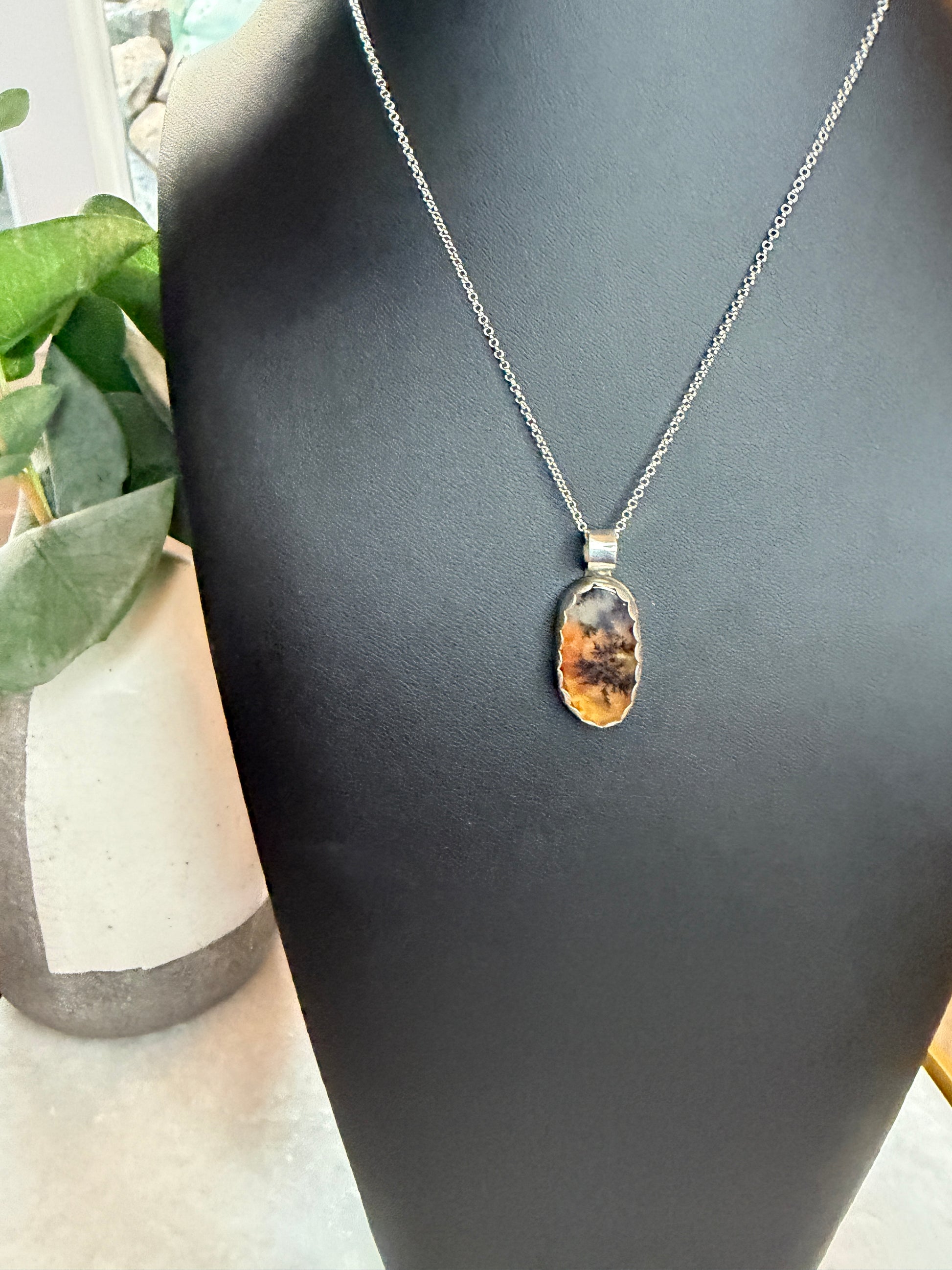 This beautiful Miss agate pendant is set in sterling silver. This necklace is a reminder that you should always look for beauty on the inside because you never know what is blooming. This pendant is shown on the sliding adjustable chain but is perfect for the carabiner necklace. Please check the chain selection or reach and reach out with any questions.