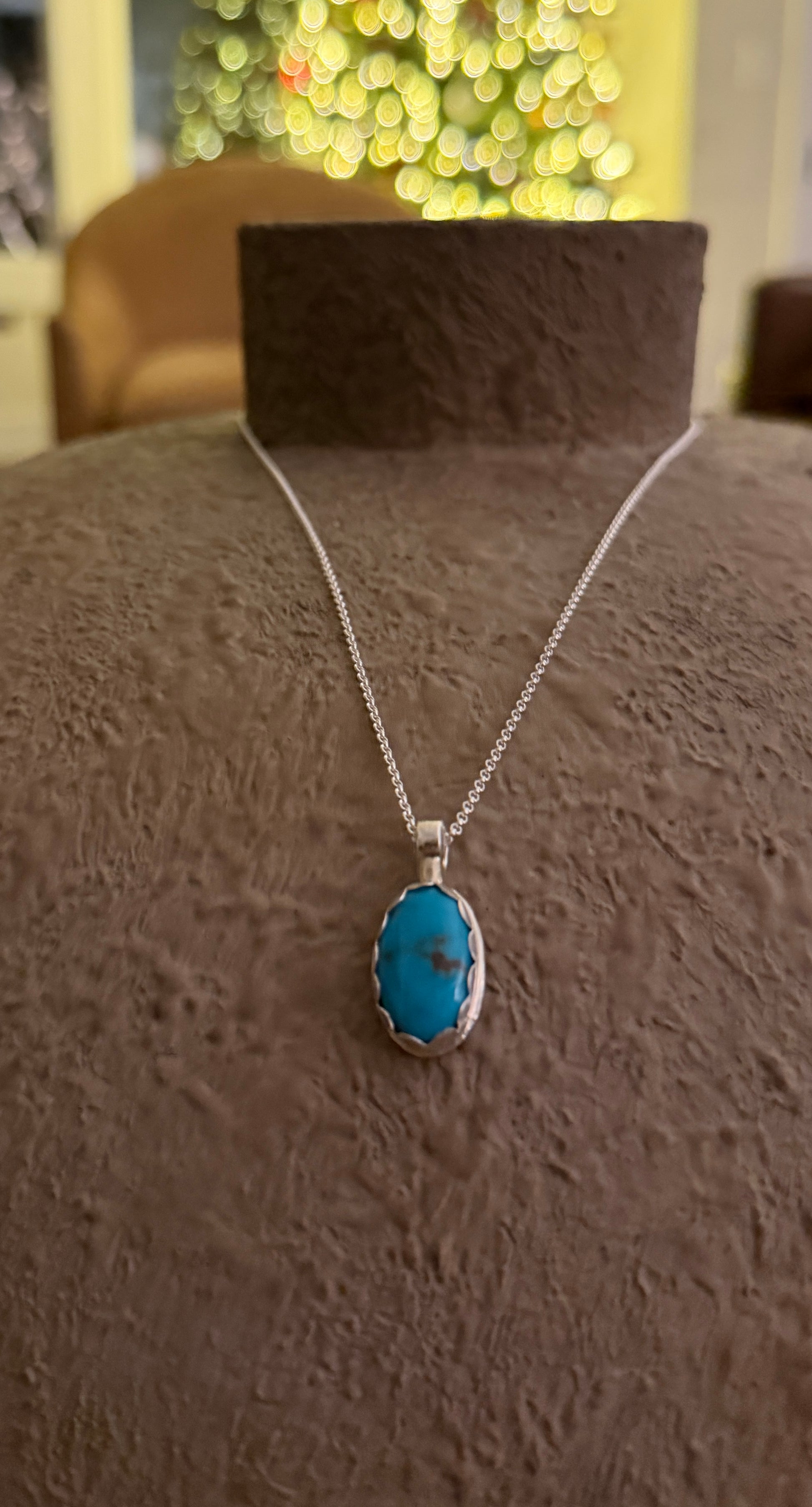 This beauty is the perfect accessory for your everyday. This turquoise stone is absolutely gorgeous! It is set in sterling silver on an adjustable sterling silver chain (up to 21”).