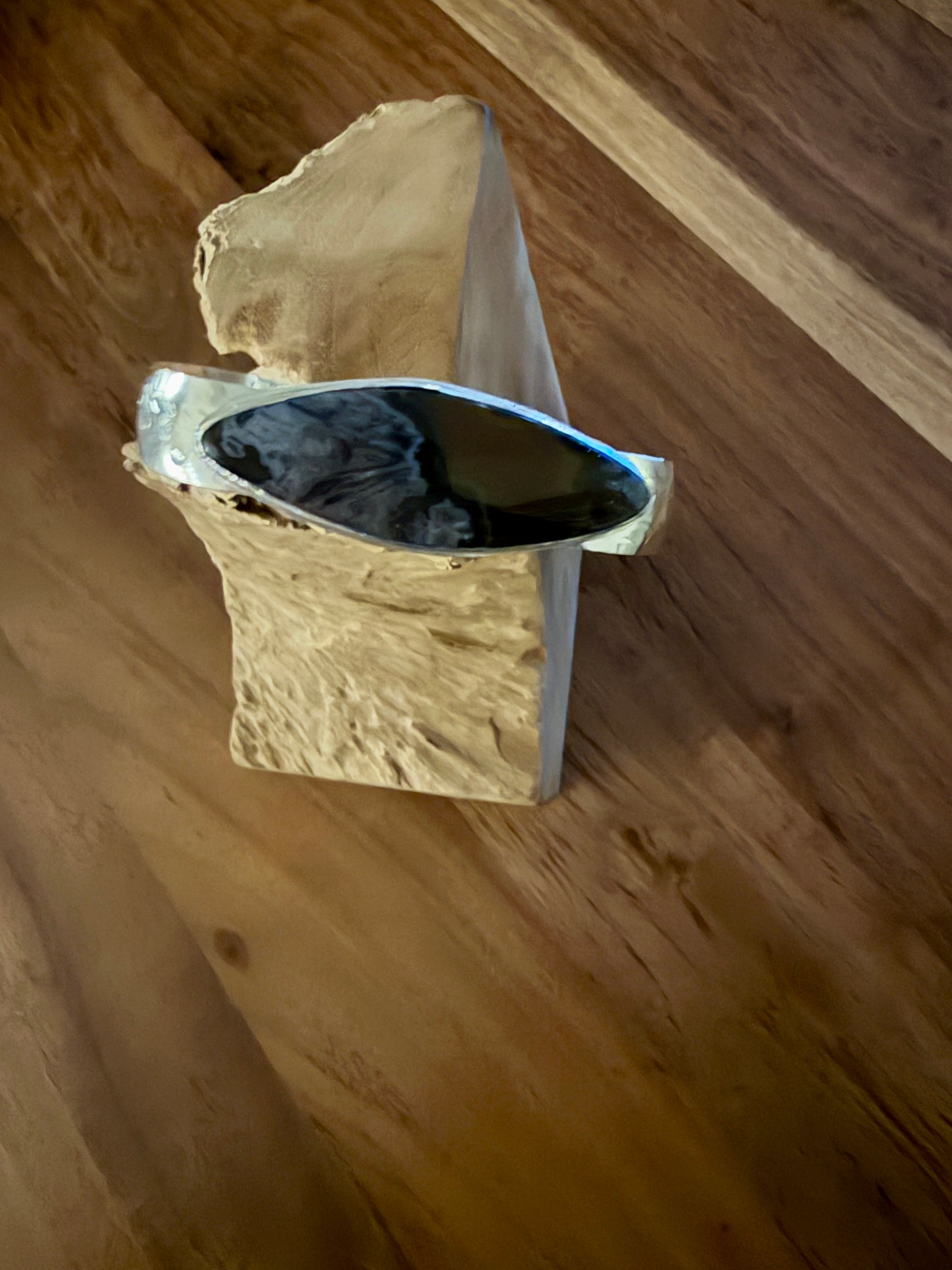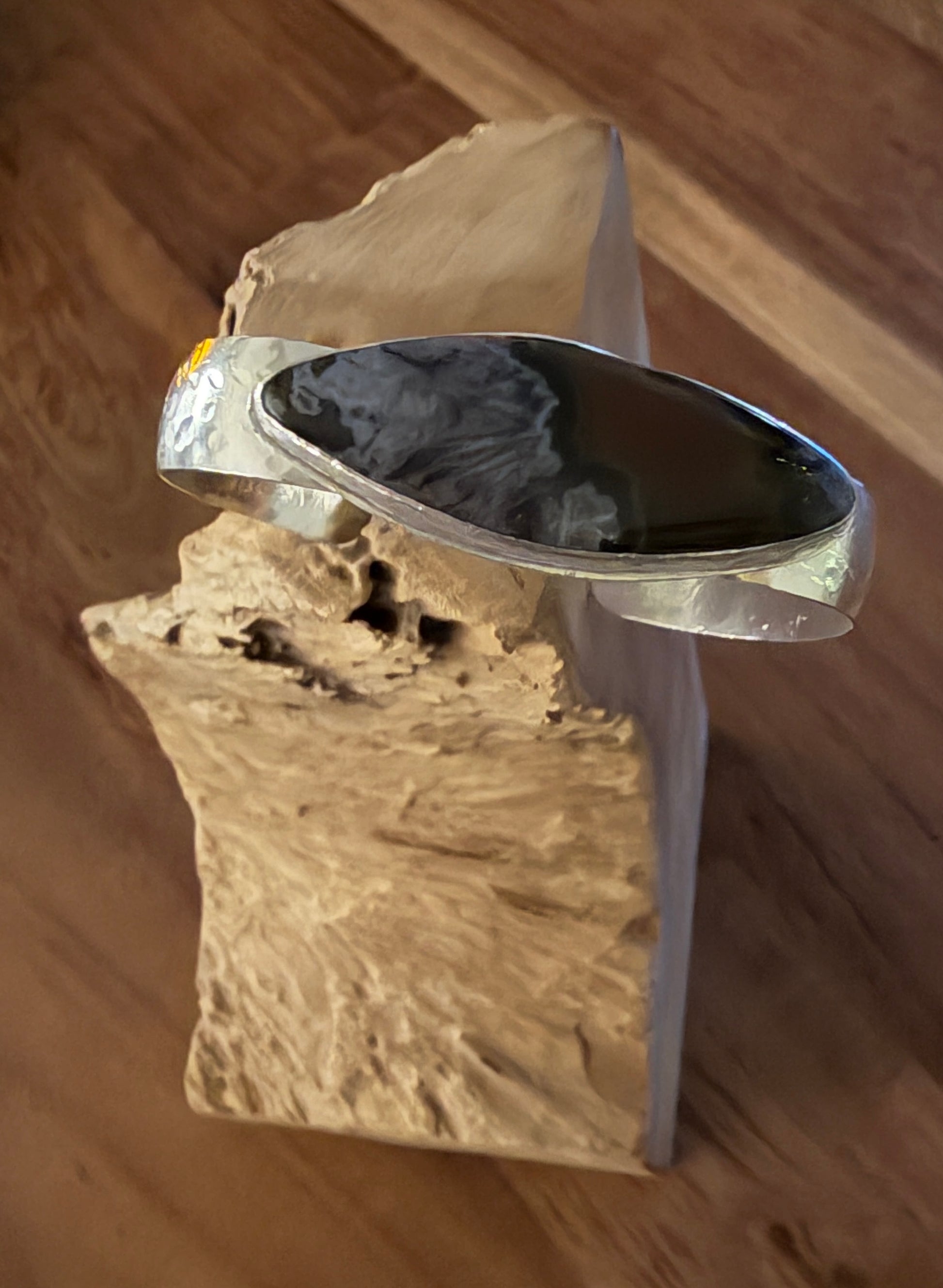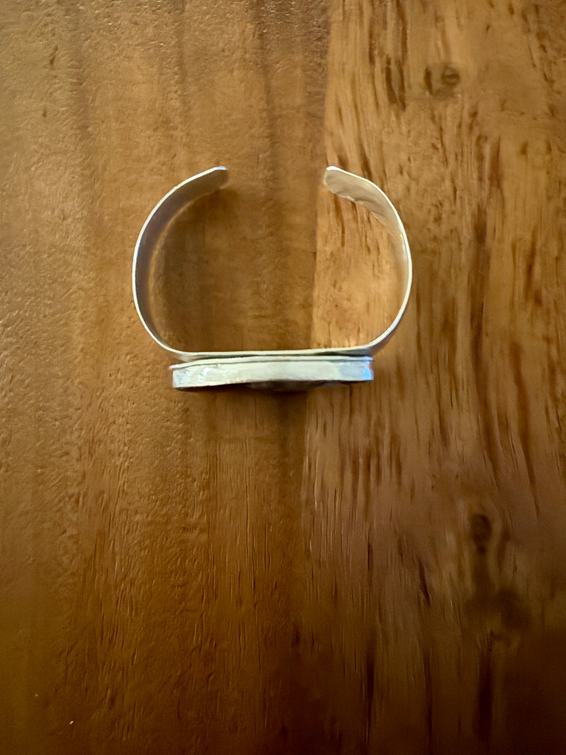 Keep your head in the clouds with this beautiful Turkish Agate. This stone is set in Sterling silver and placed on a wide silver hammered cuff. This adjustable cuff will fit most wrists up to 7.5”. This is a beautiful and unique addition to your wearable rock collection. This is one-of-a-kind and handmade.