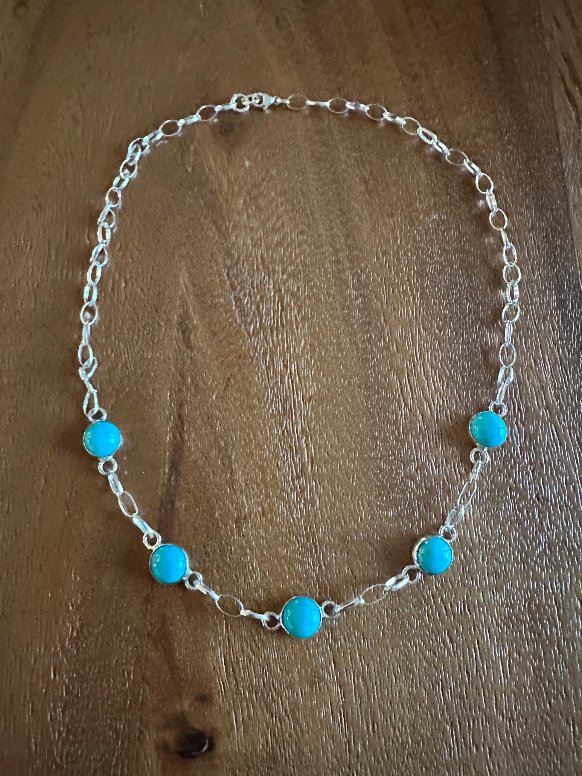 This necklace features five 8mm turquoise stones. It is placed on a flat oval chain that measures 16” in length. It can be shortened to your perfect length by for your outfit by simply clipping it on a shorter chain link. Perfect for any outfit! It pairs nicely with a turquoise bracelet as a wonderful gift set for you or a loved one.